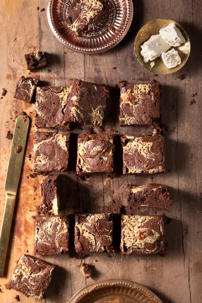 בעזרת סכין או קיסם, מערבבים קצת את הטחינה עם בלילת השוקולד, ליצירת מראה משויש.