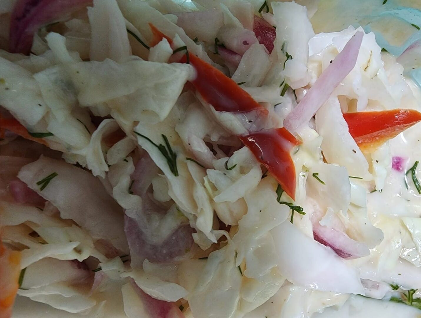 סלט כרוב לבן עם פלפל אדום, בצל, ושמיר, ברוטב קרמי ממכר ומרענן! מעולה כתוספת ליד דגים או בשר.